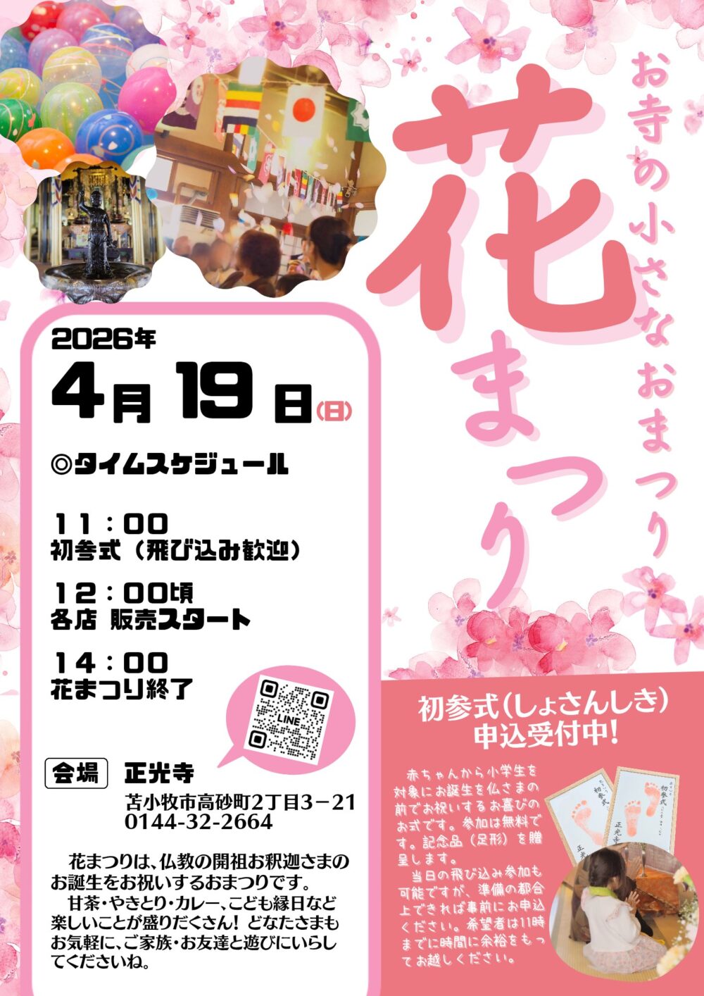 花まつりとは: 仏教の開祖であるお釈迦さまの誕生をお祝いするおまつりです。甘茶・やきとり・カレー・こども縁日など、楽しい催しが盛りだくさんのイベントです。