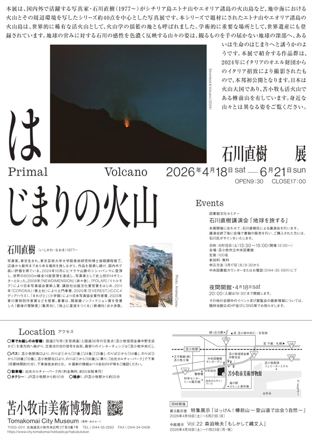国内外で活躍する写真家・石川直樹さんによる写真展が開催されます。イタリアのエトナ山やエオリエ諸島の火山島など、地中海の火山を撮影した作品を紹介。火山のまちともいえる苫小牧から、世界の火山の風景を感じられる展示となっています。