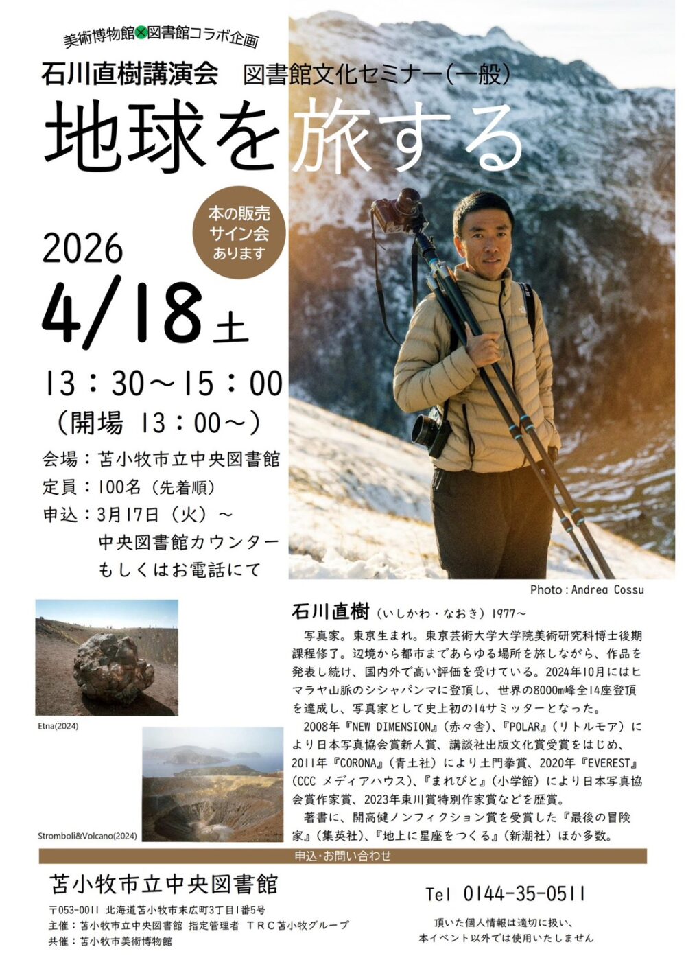 また、石川直樹さんが2026年4月18日(土)に中央図書館にて「石川直樹講演会 地球を旅する」が開催されます。定員は先着100人。申し込みは中央図書館と電話での受付なので気になる方はお早めにお願いします。