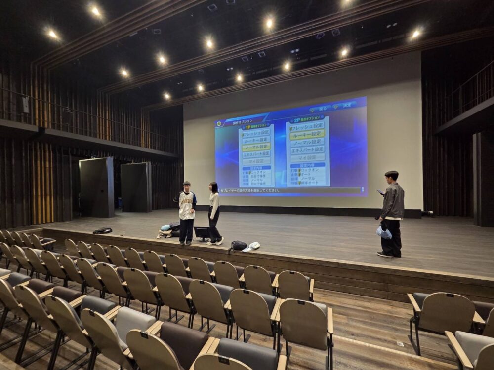 また、マルチホールでもパブリックビューイングを行うのですが、その前に「eスポーツ」のイベントを学生期成会メンバーが企画して開催してくれます。写真はeスポーツのリハーサルの様子です。