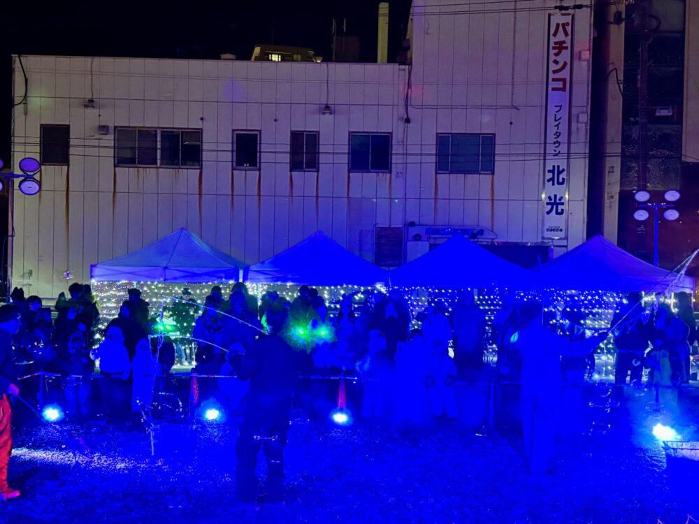 ナイトバブルのパフォーマンスの奥に、「プレイタウン北光」の垂れ幕が今も残っています。