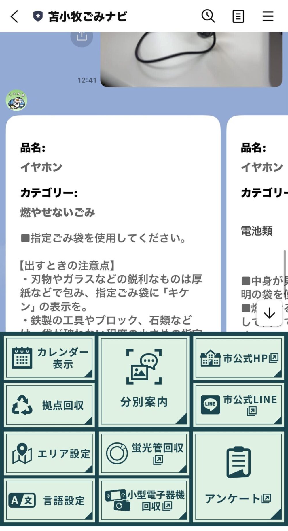 しっかり「イヤホン」と識別してくれています!また、電池が入っている場合も想定してカテゴリーを表示してくれ、ゴミを出す際の注意点なども教えてくれました。これは便利でやってみてくなりますね♪
