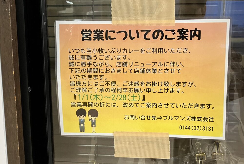 そしてJR苫小牧駅構内にある「苫小牧いぶりカレー」。以前、公開した記事では、休業期間が2026年2月28日(土)までに変更されていたことをお伝えしていました。