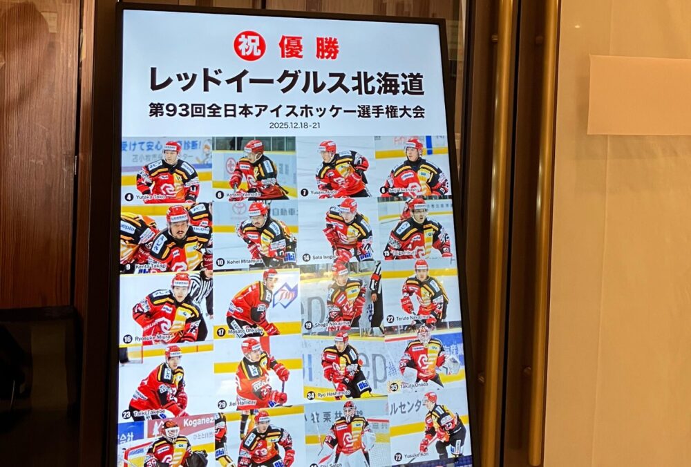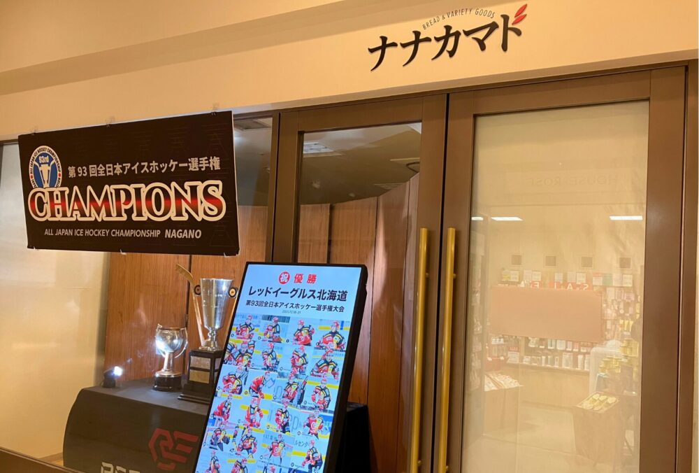 昨年12月に行われた第93回全日本アイスホッケー選手権で優勝した、「レッドイーグルス北海道」のブースが設置されていましたよ!