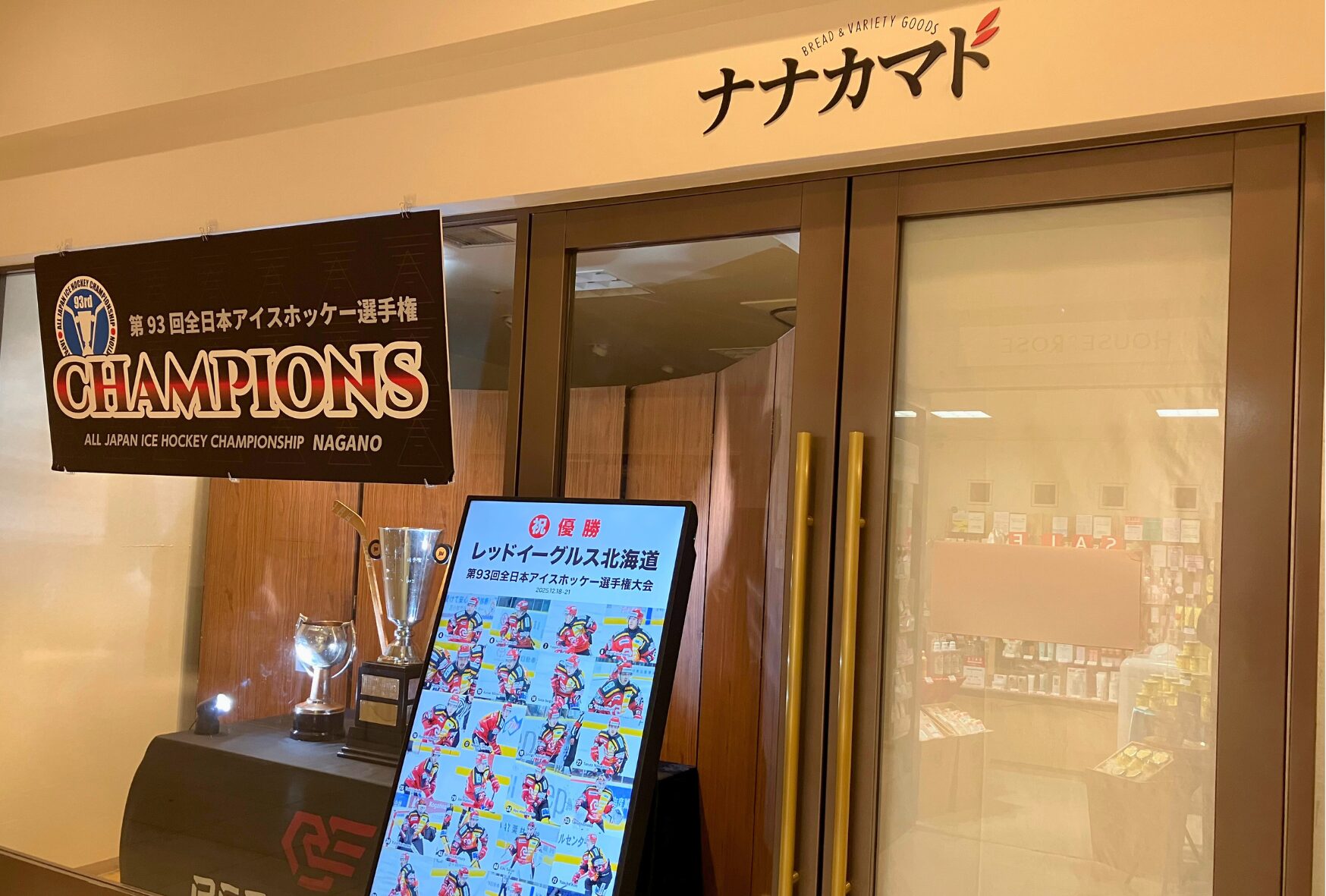 昨年12月に行われた第93回全日本アイスホッケー選手権で優勝した、「レッドイーグルス北海道」のブースが設置されていましたよ!