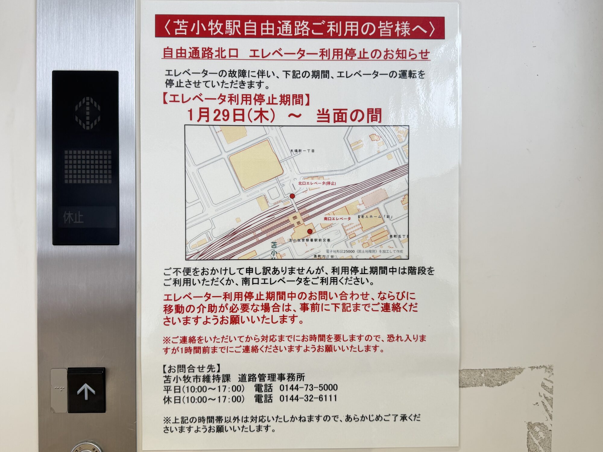 北口側からJRを利用される方やバスを利用される方にとって、エレベーターの停止は大きな影響がありそうです。特に車いすを利用されている方、ベビーカーをお持ちの方、足の不自由な方は不便になりますので事前にご注意ください。