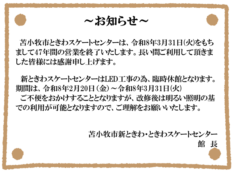 以前から、ときわスケートセンターの存続についてはニュースなどでも話題になることが多かった印象ですが、今回正式に新ときわスケートセンターのホームページにお知らせがありました。