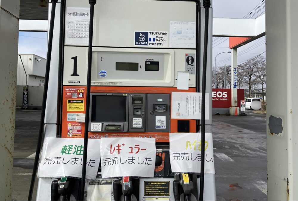 軽油、レギュラー、ハイオク…共に「完売しました」と張り紙が貼られています。