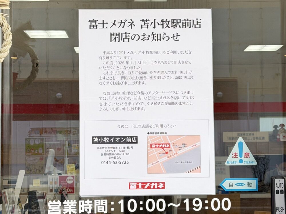 そんな「富士メガネ 苫小牧駅前店」ですが、今回閉店を知らせる案内が入り口にありました。