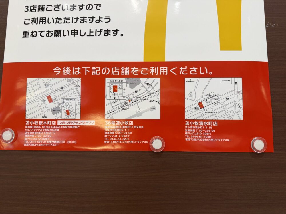 閉店後の市内のマクドナルドは「苫小牧桜木町店」「36号苫小牧店」「苫小牧清水町店」の3店舗となりますね。