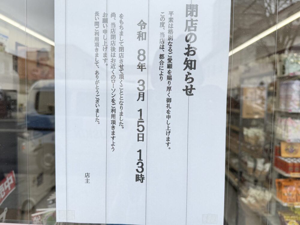 閉店日は令和8(2026)年3月15日(日)の13時と書かれています。