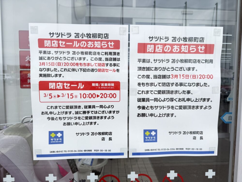 柳町店の閉店後は、苫小牧市内でのサツドラの店舗は「しらかば店」「ときわ町店」の2店舗となりそうです。