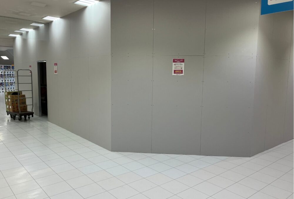 エレベーターで2階に上がってすぐのところにある「楽天モバイルショップ MEGAドン・キホーテ苫小牧店」。現在は、ご覧の通り、店舗全体が壁に覆われていて、リニューアルオープンに向けて準備が行われています。