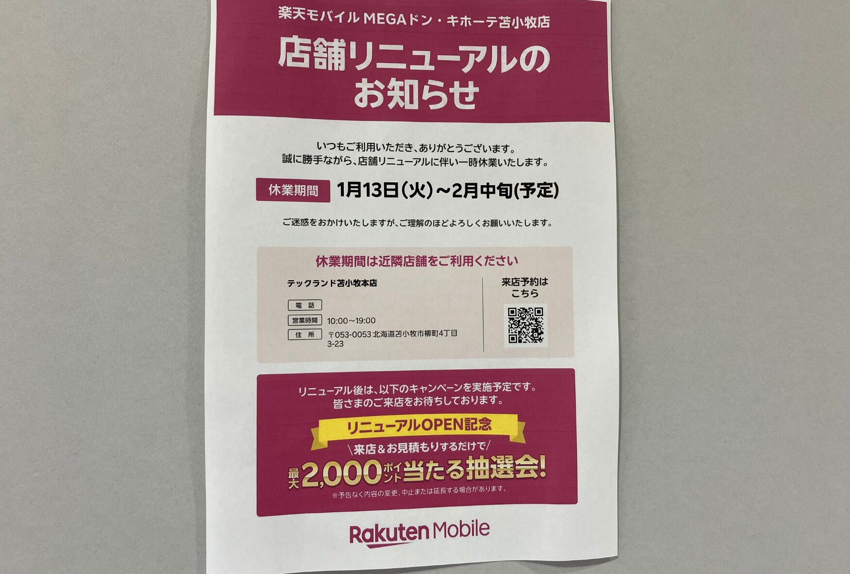 なお休業期間中も、柳町4丁目にある「楽天モバイル テックランド苫小牧本店」は利用できるとのことです。