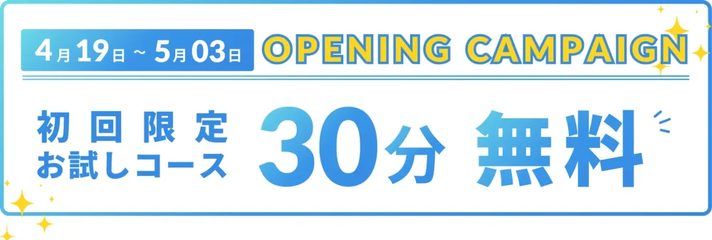 2026年4月19日(日)〜 5月3日(日)の期間限定で、30分無料で店舗をご利用いただけます。