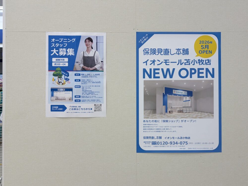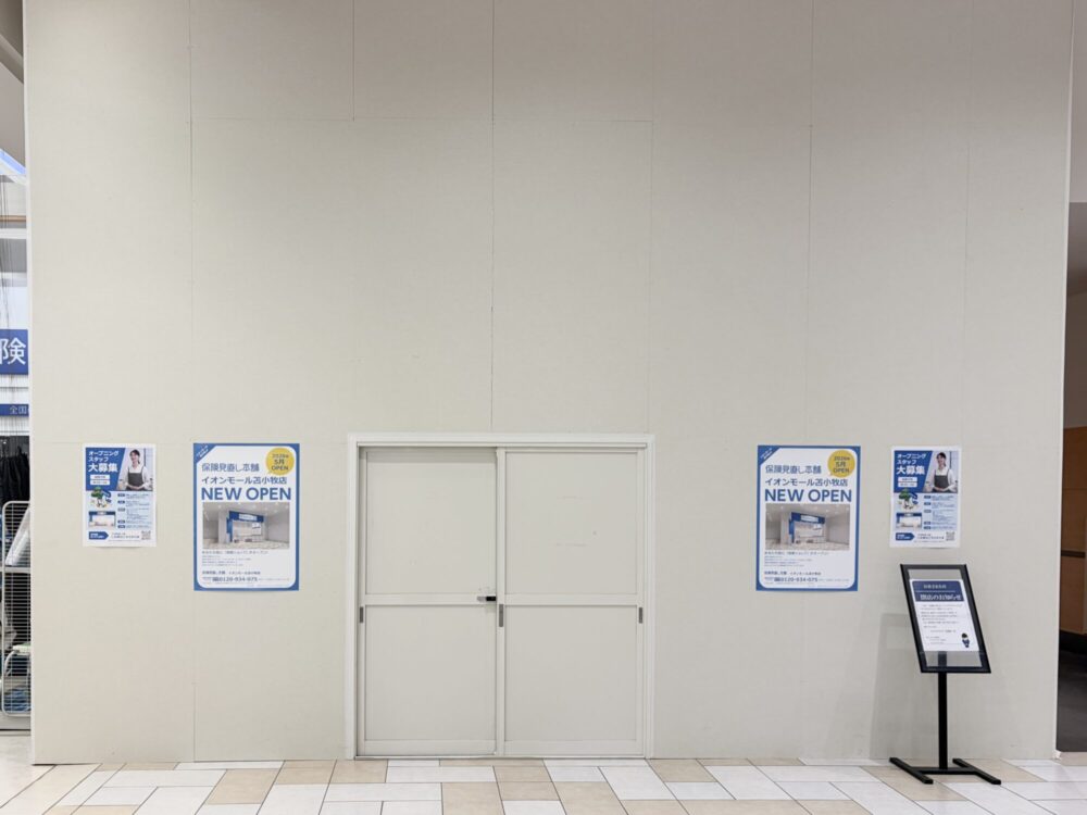 場所は1階レストラン街から西側へ進んだあたりで、以前「カメラのキタムラ 苫小牧・イオンモール苫小牧店」があった場所にお知らせが貼られていたそうです。