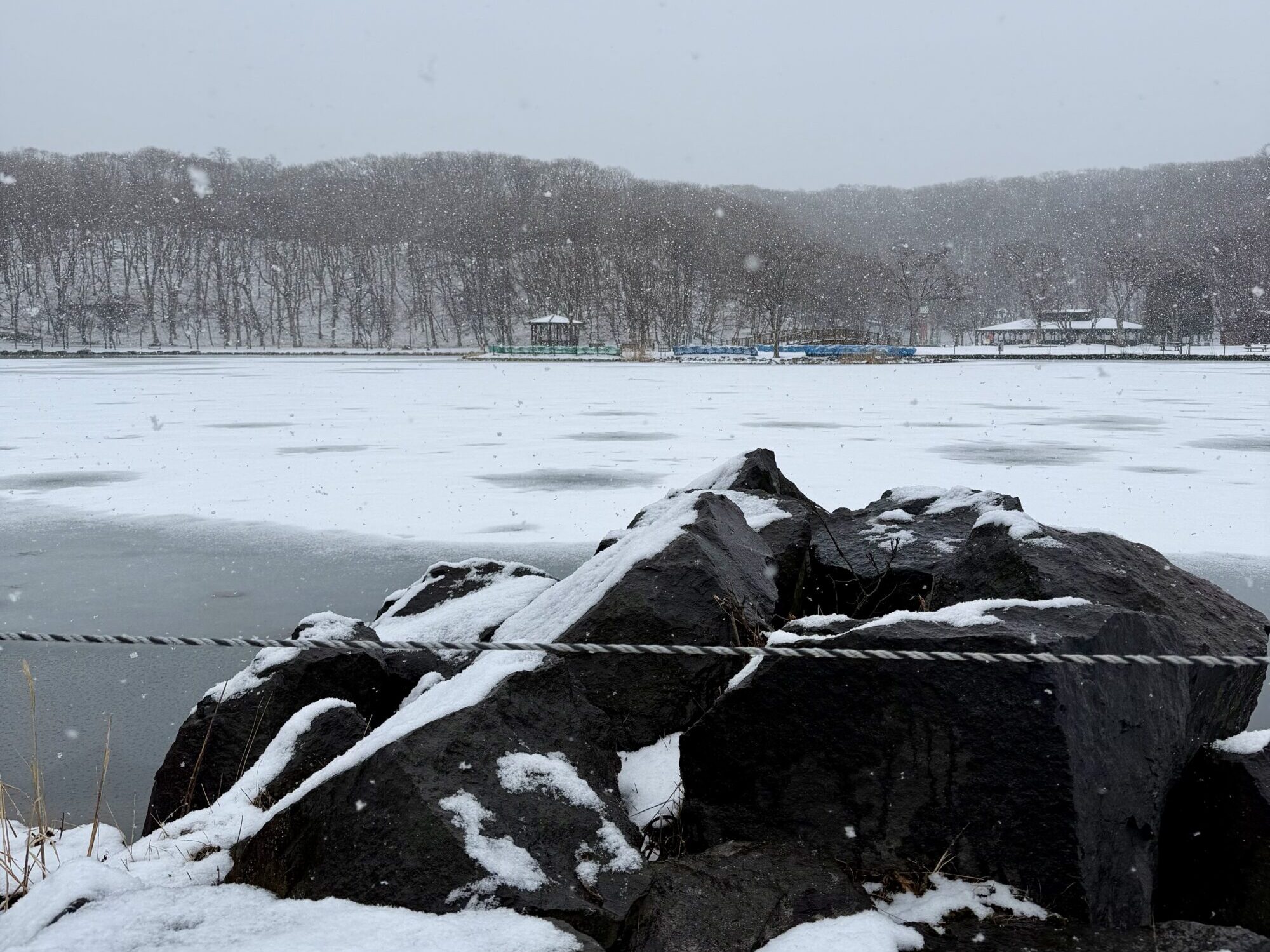 2026年3月4日(水)、季節外れの雪が降りましたね。今朝の金太郎池も、湖面が真っ白になっていました。