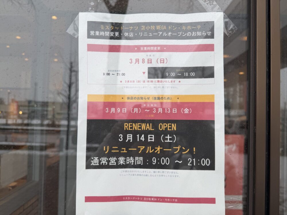 貼り紙によると店舗リニューアルのため休業、営業時間の変更などがあります。