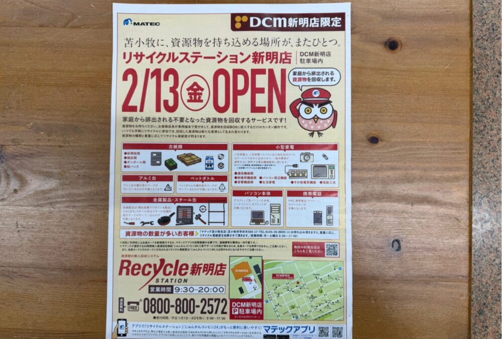 苫小牧市のDCM(旧ホーマック)リサイクルステーションは、DCM苫小牧弥生店の駐車場内にて稼働中ですが、2026年2月13日(金)、新明町3丁目にある「DCM 新明店」にも新しくできました。