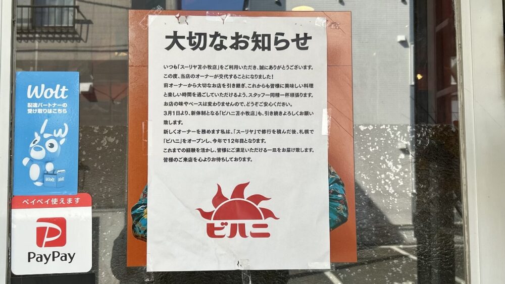 店頭には「大切なお知らせ」と題した貼り紙があり、オーナーが交代することになった旨と、2026年3月1日から「ビハニ苫小牧店」となることが記されていました。