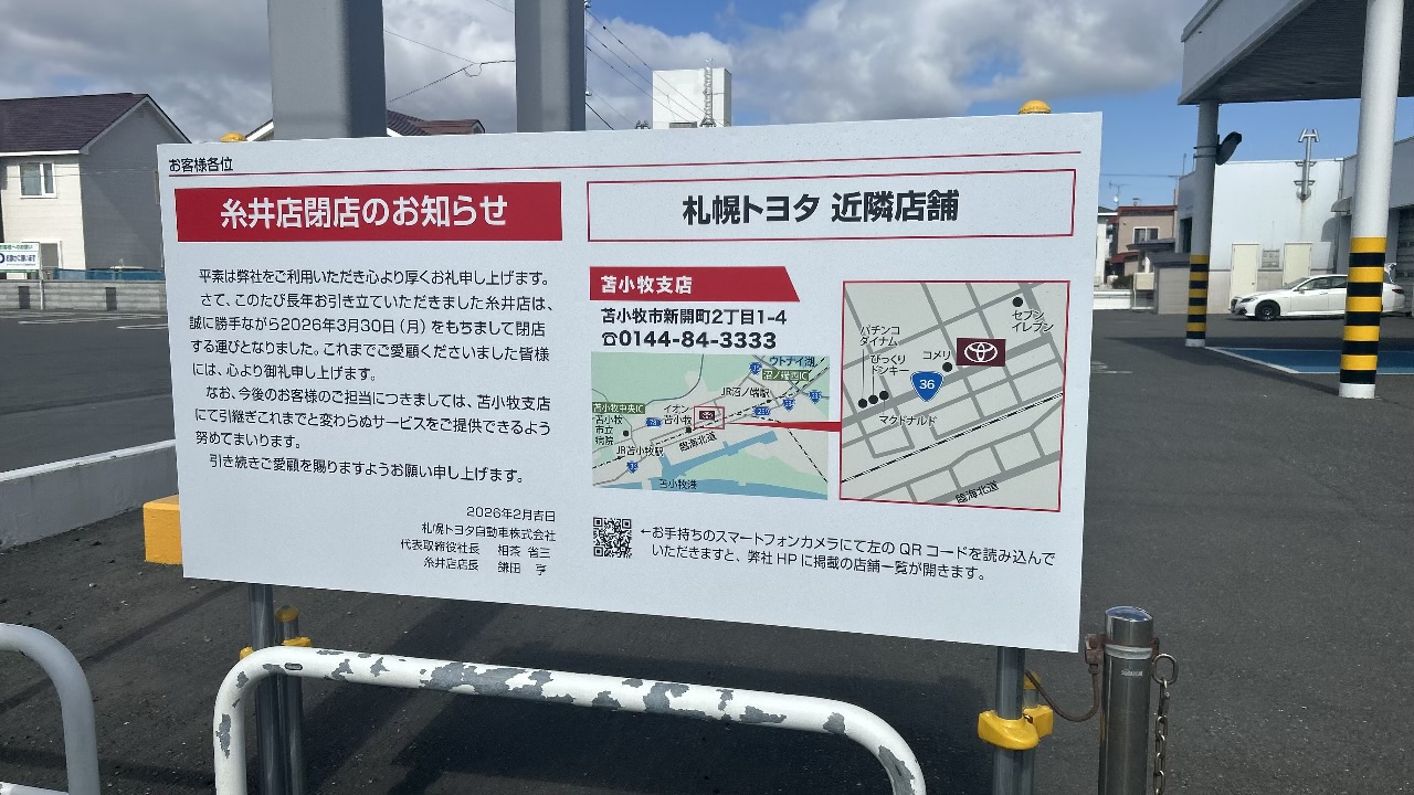 永福町1丁目、国道36号線沿いにある自動車販売店「札幌トヨタ自動車 糸井店」が2026年3月30日(月)で閉店するそうです。