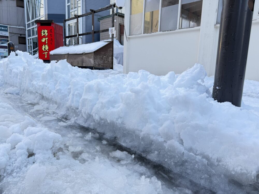 上の写真は午後15時頃の錦町一条通り。路肩には水分を含んだ雪が歩道にまであり、車の運転だけでなく歩行者も注意が必要な状況です。