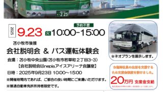 道南バス 会社説明会&バス運転体験会 会社説明会&バス運転体験会開催日時:2025年9月23日(火・祝)10:00〜15:00※開催時間内であれば、都合の良い時間に来場可能です場所:苫小牧中央公園(苫小牧市若草町2丁目3-3)※会社説明会はnepiaアイスアリーナ会議室で開催内... 2025/09/17