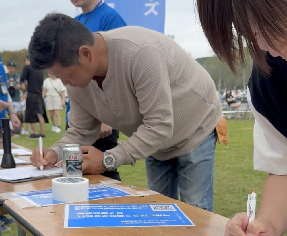 現在、イベント会場やショッピングモールなどで行われている、「北海道日本ハムファイターズ2軍施設を誘致する会(F×T PROJECT)」の署名活動。
