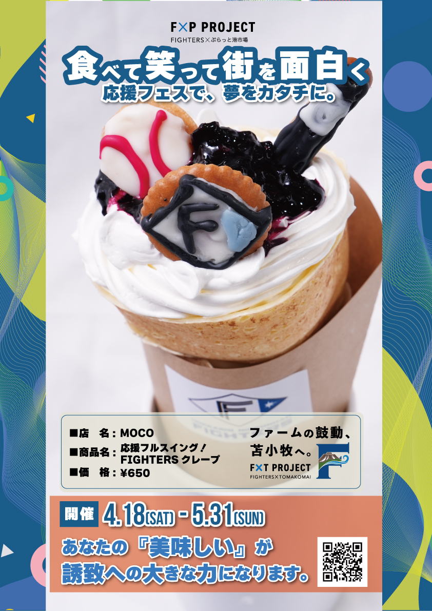 MOCO green grocery応援フルスイング!FIGHTERSクレープ が650円で楽しむことができます。ほかにもメニューがたくさんありますので、SNSなどでご確認ください。