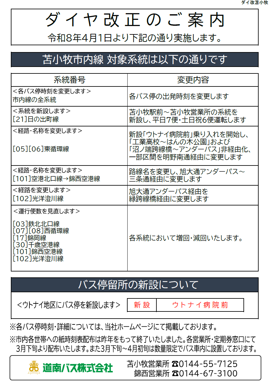 2026年4月1日(水)に道南バス苫小牧市内路線バスのダイヤが4月に改正します。