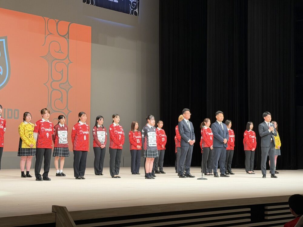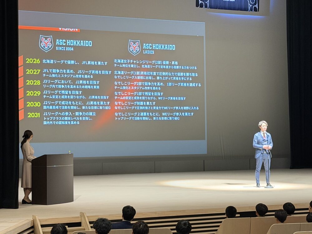 注目を集めたのは、古川社長から発表された今後のビジョンです。スクリーンに映し出されたロードマップには、2031年にJ1リーグへの参入や、なでしこリーグ連覇、WEリーグ参入という壮大な目標が掲げられていました。夢物語ではなく、着実にステップを登る覚悟に、会場からは大きな拍手が沸き起こりました。