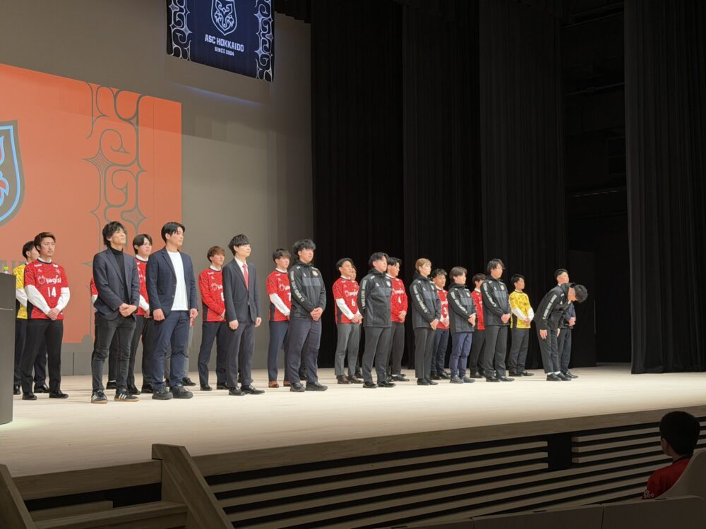 最後は、登壇した全選手、スタッフ、そして会場のファンも一緒に記念撮影が行われました。ASC北海道のシンボルであるオオカミをイメージしたポーズで、会場の心は一つになりました。