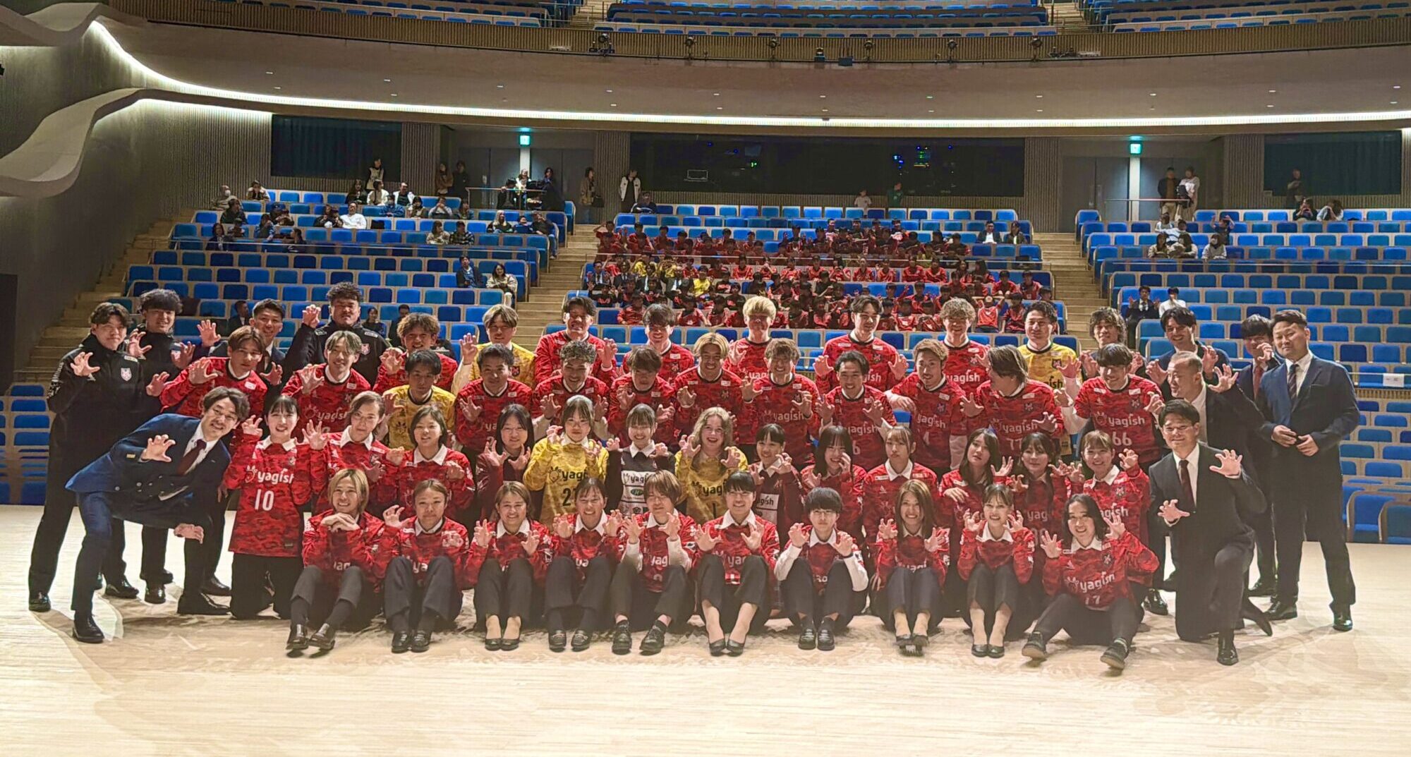 最後は、登壇した全選手、スタッフ、そして会場のファンも一緒に記念撮影が行われました。ASC北海道のシンボルであるオオカミをイメージしたポーズで、会場の心は一つになりました。