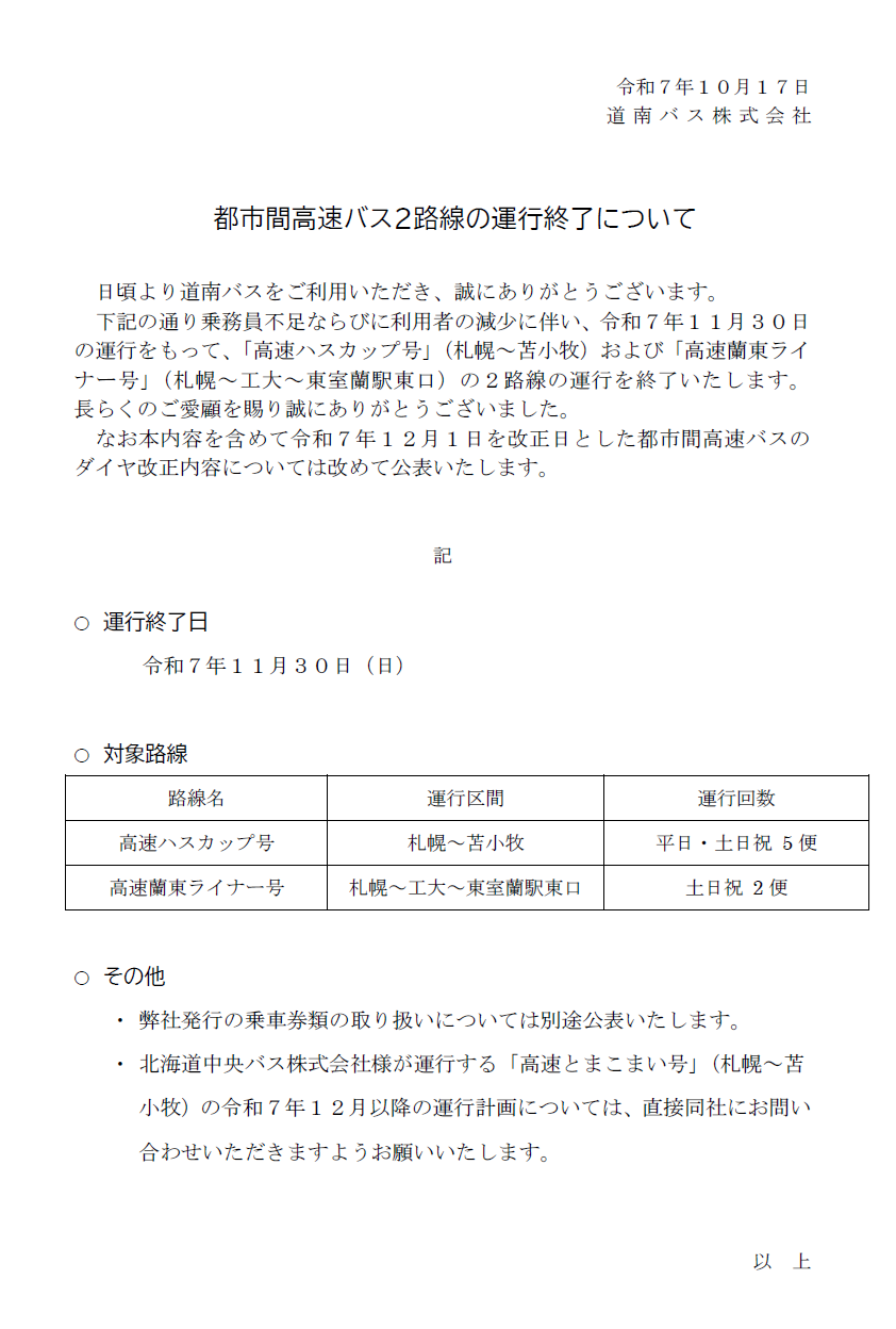 2025年10月17日(金)に発表された、道南バスからのお知らせです。