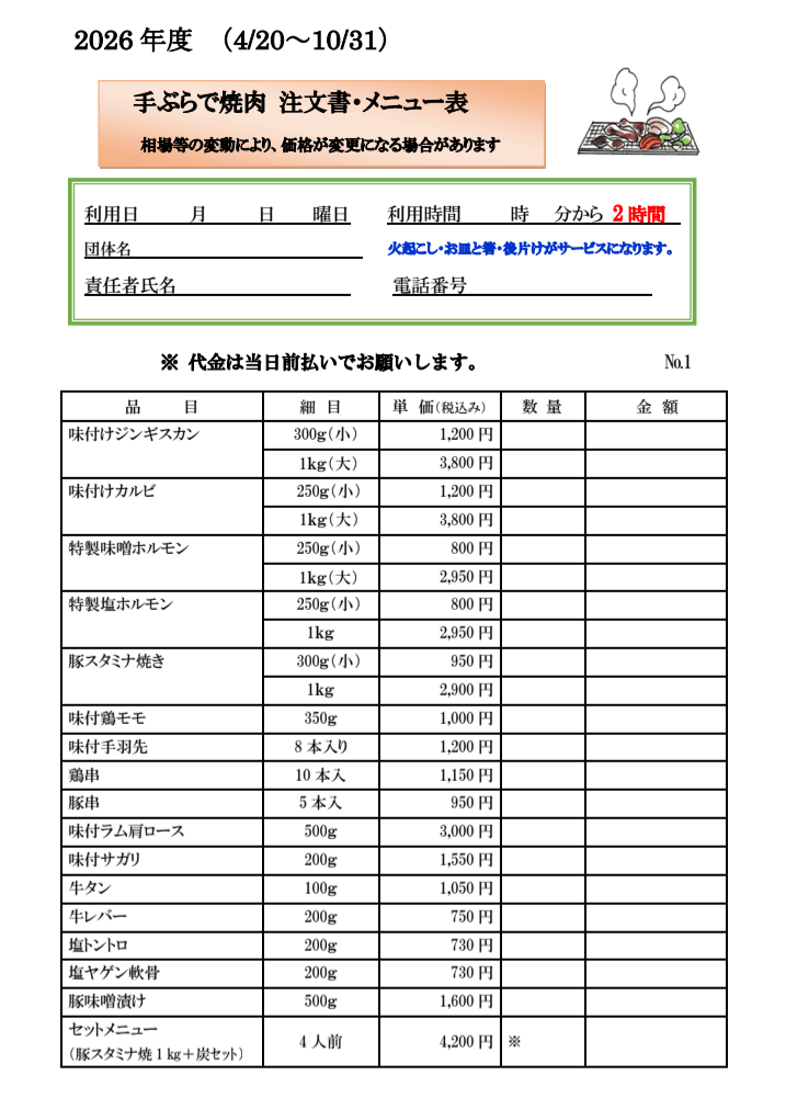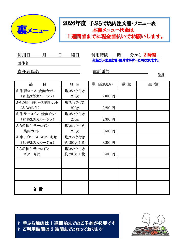 こちらが今年から品数が増えた「手ぶらで焼肉セット」のメニュー表です。お肉は「肉のあおやま」さんのものを使用。