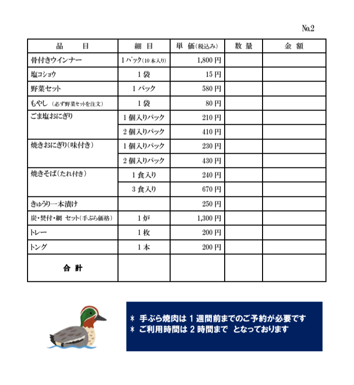 - サービス内容: 火起こし、お皿・箸、後片付け