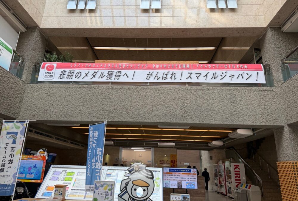 みなさんの注目競技は何ですか?注目選手は誰ですか?苫小牧市民の関心事は、やはり女子アイスホッケー日本代表・スマイルジャパンではないでしょうか。苫小牧市役所ロビーにも横断幕が飾られていて、既に盛り上がりを見せています!